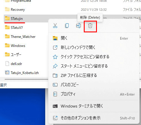 - 株の達人のフォルダ(「STatujin」)を削除します。 「STatujin」フォルダにカーソルを合わせて、右クリックします。