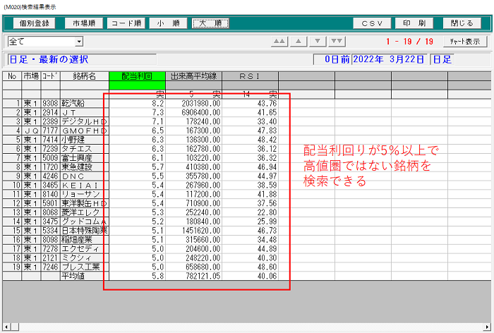 こちらは株の達人の銘柄選択画像となります。今回は例として配当利回りを5%以上としていますが、これに出来高の条件や、RSIが高値圏になっていない50%以下の条件を加えています。