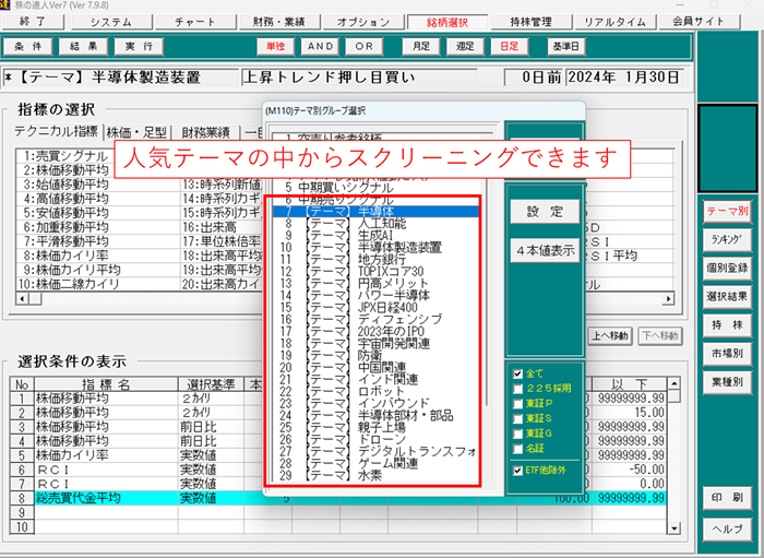 こちらは株の達人の銘柄選択画面ですが、テーマ別というグループから現在注目度が高い人気テーマを設定することができます。現在ですと半導体や人工知能、生成AIといったグループが登録されています。この中から上昇トレンドの押し目状態となっている銘柄などスクリーニングすることも可能です。