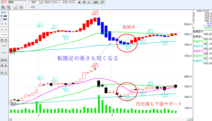 特に株価が強く売られた際には、転換足は当然に青になりますが、足も長く伸びていきます。またその後に下落の強さが弱まると、転換足の長さも徐々に短くなってきますので、近々赤に転換する可能性があることが事前に判別することができます。加えて75日や200日移動平均線などの下値抵抗があれば、より下げ止まる可能性も高まります。今回はこのような転換足の見方を動画で解説いたしましたので、ぜひご覧ください。
