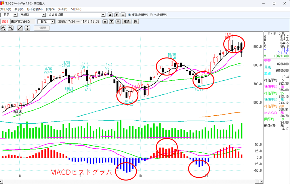 MACDのクロスだけで判断すると、上昇局面ではすでに株価が大きく上がった後にエントリーしてしまい、下降局面では下げが進んだ後で売却することになりがちです。そこでヒストグラムを見ると、棒グラフが下に伸びている時は短期的な下落局面、棒グラフが上向きに転じると反発の兆しが表れます。特にマイナス圏からプラス圏へ切り替わる場面は勢いが出やすく、短期的な上昇を狙う際の良いタイミングになります。