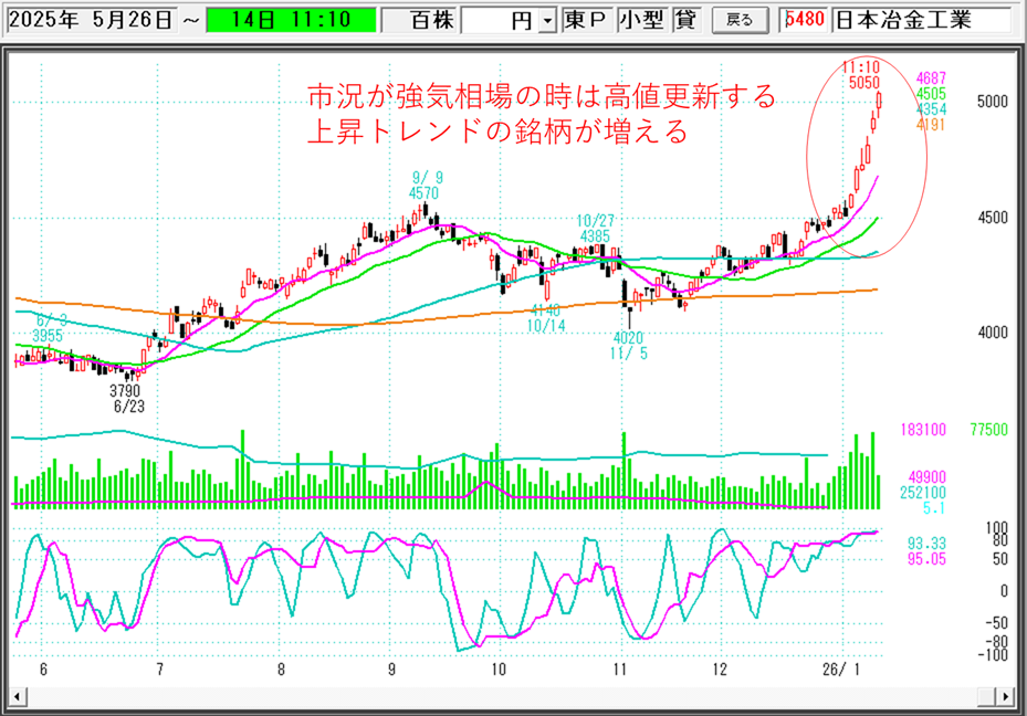 市場全体のトレンドが強まってくる局面では、最高値を更新する銘柄や、明確な上昇トレンドを形成する銘柄が一気に増えてきます。日経平均やTOPIXが高値を更新していくような環境では、右肩上がりの銘柄や新高値銘柄が全体の中で数百銘柄規模に広がることも珍しくありません。それだけ市場全体の地合いが良く、トレンドの強い銘柄が増えている状況と言えます。