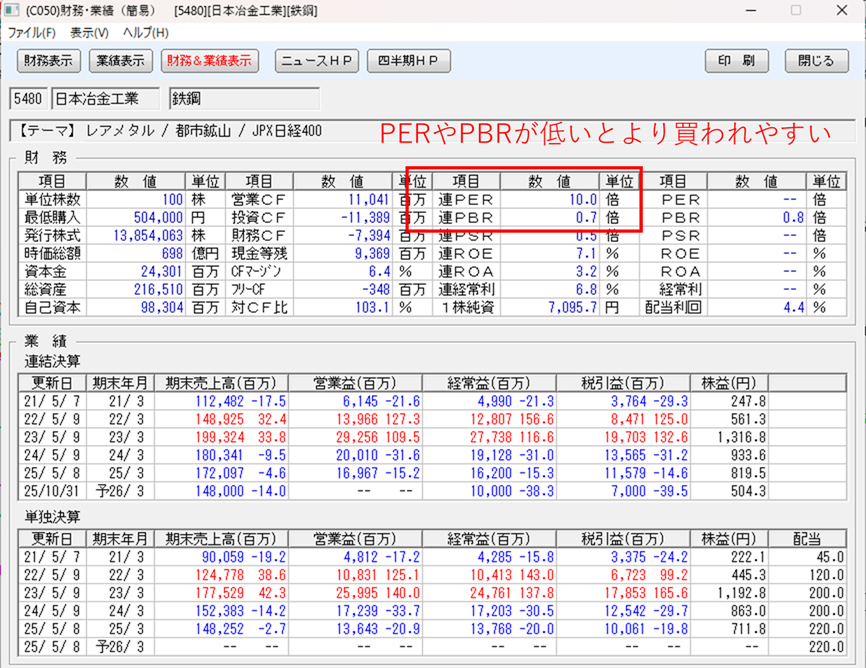 そのため、株価の移動平均線などテクニカル面でのトレンド確認だけでなく、PERやPBRといったファンダメンタル指標もあわせて確認することで、割安さとトレンドの強さを兼ね備えた銘柄を狙うことが可能になります。割安な水準にあるということは、業績への懸念や材料不足などが背景にある場合もありますが、市場全体が上昇基調にある局面では、そうした銘柄が見直され、相場全体の流れに乗って上昇するケースも多く見られます。