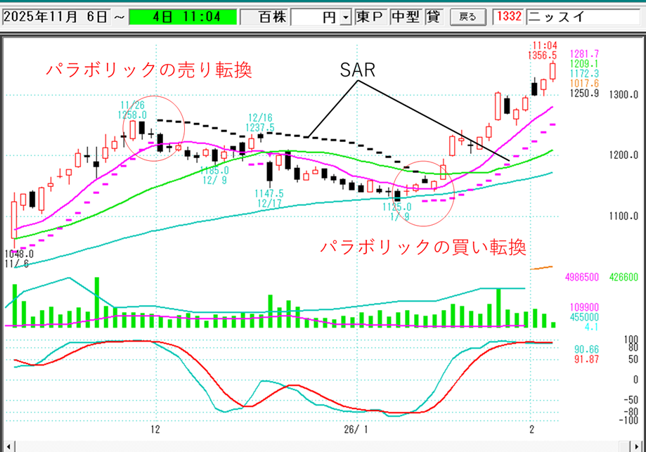 それでも、パラボリックの最大の利点は、売買タイミングが非常に明確で分かりやすい点にあります。これから株価が上昇する可能性がある場面で、はっきりとシグナルが出るため、テクニカル分析に慣れていない方でも判断しやすい指標といえます。