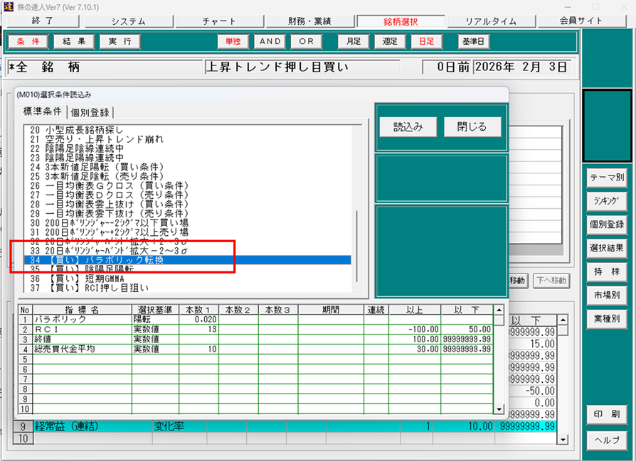 パラボリックは株の達人の銘柄選択のスクリーニングにも活用できます。標準条件の中に「【買い】パラボリック転換」という項目があり、これを使うことで、ちょうど買い転換した当日の銘柄を抽出することが可能です。さらにRCIなどの条件を組み合わせることで、株価がある程度下落したあとに反転した銘柄を見つけやすくなり、だましを減らす工夫もできます。