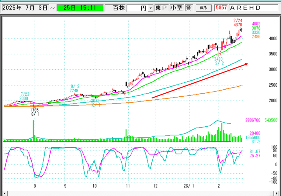 実際に、レアアース関連銘柄であるAREホールディングス(5857)などは、途中で細かな調整を挟みながらも、全体としては右肩上がりの上昇が続いています。一時的な利食いや短期調整が入っても、下げ止まりが早く、再び高値を更新していく。このような「強い循環」が見られる銘柄こそ、効率よく狙いたい対象です。