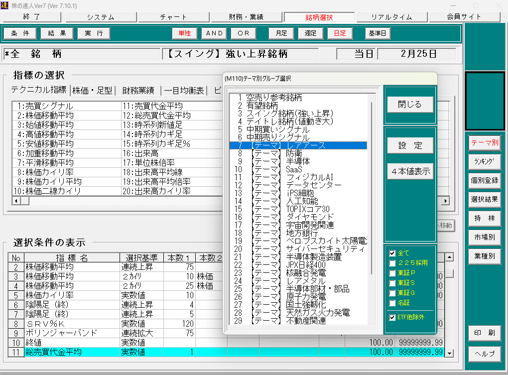 同様に、防衛関連など他のテーマに切り替えても、同じ条件で強い上昇トレンド銘柄を抽出できます。テーマ性のある銘柄は、日経平均がもみ合う局面でも高値更新を続けることがあり、指数以上に強い値動きを見せるケースも少なくありません。