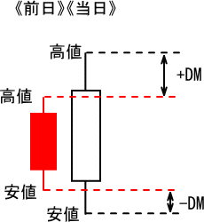 1.+DM>-DMの場合、+DM=当日の高値-前日の高値、-DM=0